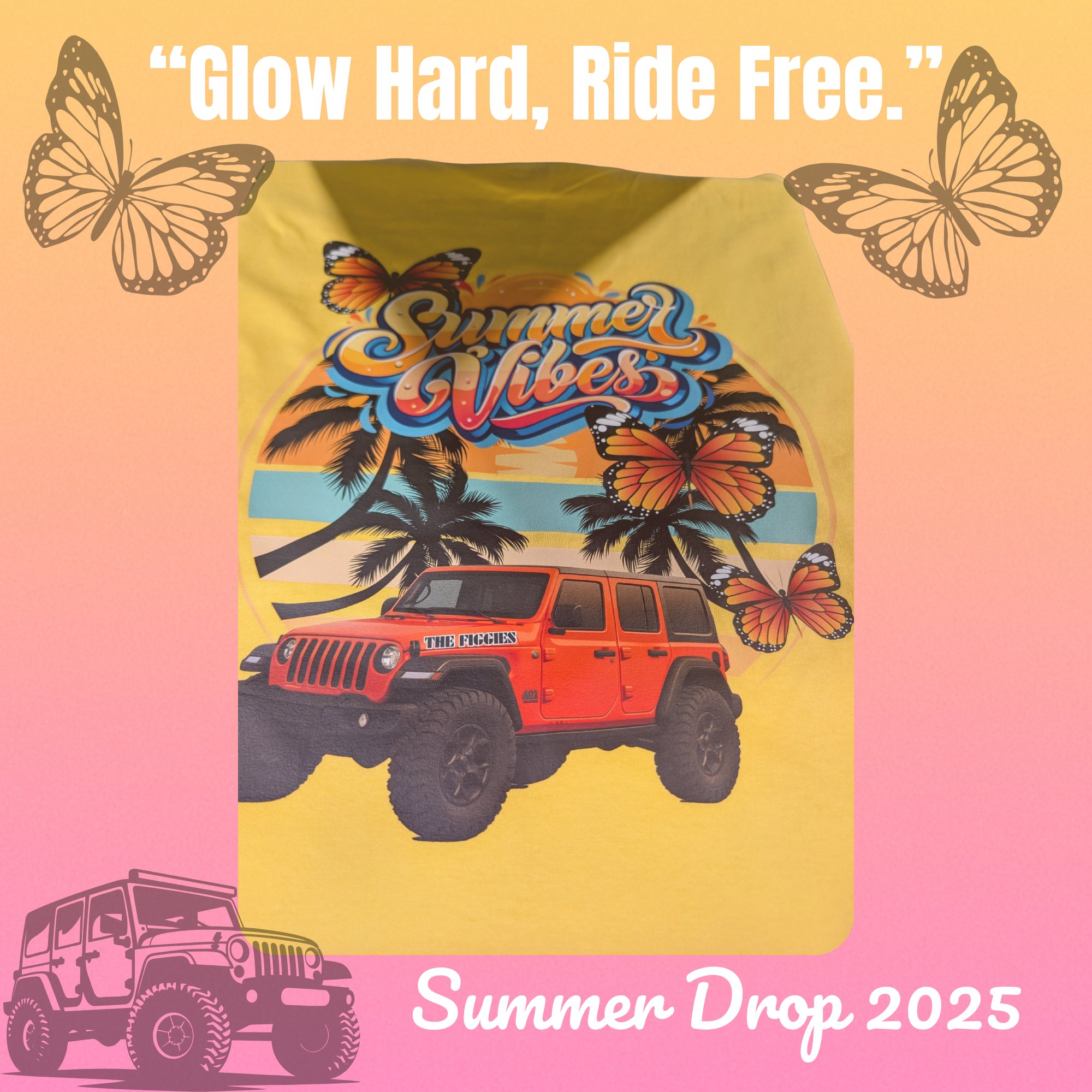 The *Summer Vibes – Yellow Edition* is pure sunshine on cotton. With a golden backdrop, this tee features the iconic Jeep, butterflies, and palm trees that scream freedom. It’s for the ones who chase sunsets and live loud.